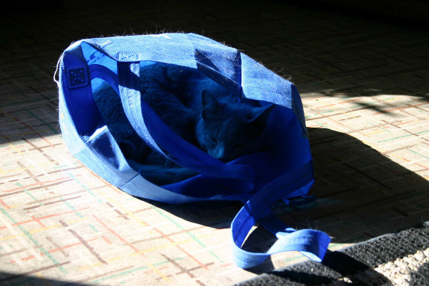 Back in October, we rescued a kitten from under a rock crib (you can access my LJ entry here: http://annmariehardin.livejournal.com/?skip=10). We’ve finally decided she was most likely abandoned my her mother because she’s quite a bit smaller than her siblings, and to tell the truth, she’s not exactly the sharpest tack in the pack. But, she’s in now and is turning out to be a very interesting cat. She and Sprout (the 10-lb dog) don’t either one seem to know they are different species, and play just like litter mates. He’ll even get toys for her, to the point of bugging me until I get them if neither one of them can reach them. Lately, she seems to have taken a liking to napping in a re-useable shopping bag that was emptied and not put away. She has relocated it to the middle of the morning sun pool and spends most of the morning curled up napping in the sun – inside the bag. When she’s not napping, she’s playing with the straps. The truly amusing thing is that we haven’t picked up the bag and put it away because the cat’s using it. Do you ever wonder who is actually in charge?