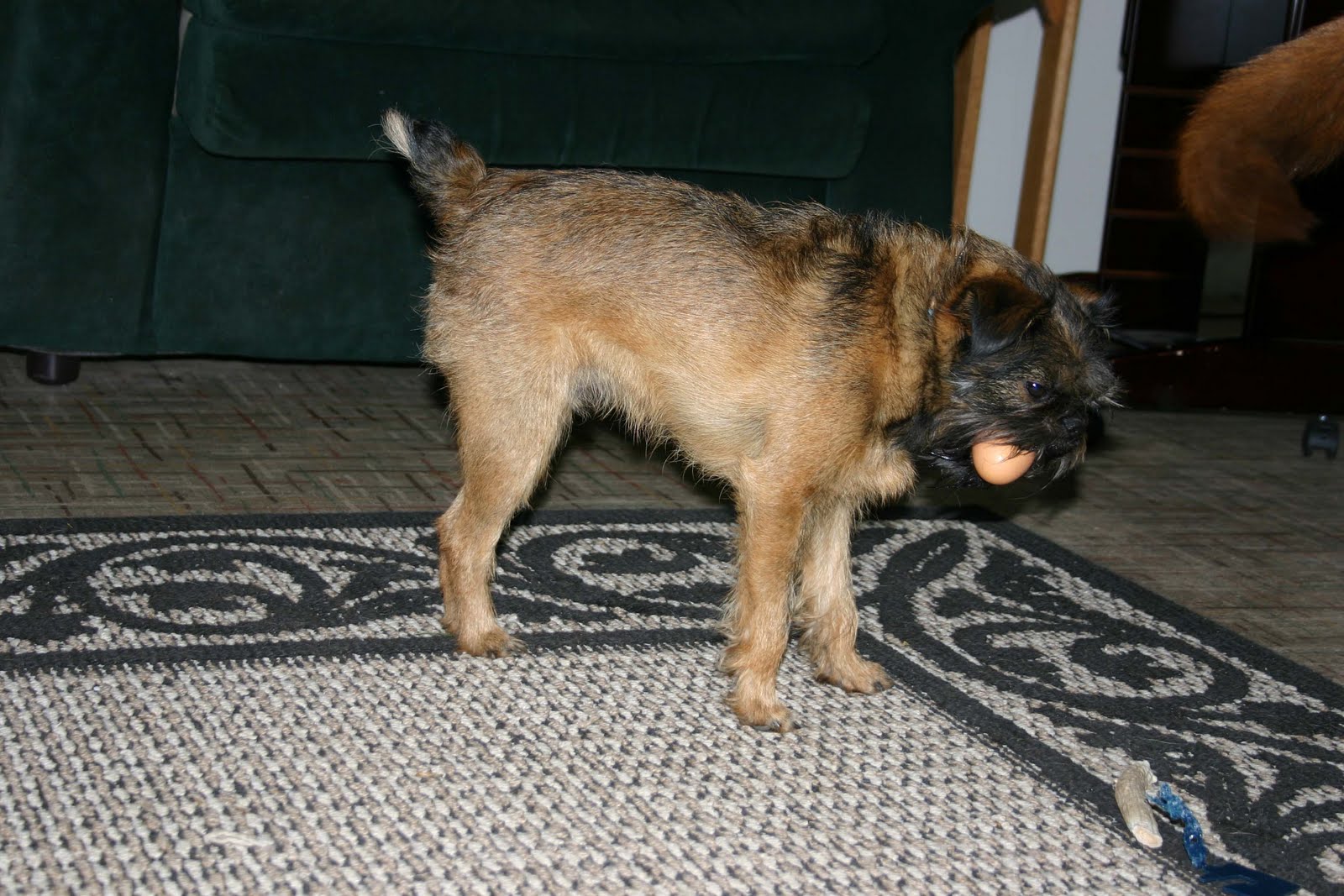 It was a whole chicken egg!! He had been carrying it around the whole time after he snatched it. He had not broken it. It had a few teeth marks, but he had not broken the egg. He is a little thief, you have to be careful with setting down tools when he is around also. I never would have guessed that he could get an entire egg in his mouth. He weighs just under 10#.