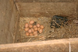 Yes, that is a pile of eggs in the barn, rather than in the chicken coop where they belong. 18 of them to be exact. I don’t know if you’ve noticed that all of the rebel chickens are laying fairly dark brown eggs, but I have. Steve thought he wanted to go for brown eggs instead of the green our first breed choice produced, so he purchased a brown egg laying hybrid chicken. These hens range much farther afield than our original flock, and are obviously not as imprinted on the coop. Further evidence of that fact was offered to me last night. Sarah had found a mostly eaten chicken (if anyone knows what predator eats everything from the stomach-side and leaves the skeleton and wings all intact, let me know), so I had decided to lock the coop at night. It was full dark, and all of the chickens should have been inside. But, I found five of these little buggers huddled on the old stump by the old house. They were sound asleep, so it was a simple matter to pick them up one at a time and carry them into the coop, but still……the coop gate was open, and that’s where they should have been. Stupid chickens.
