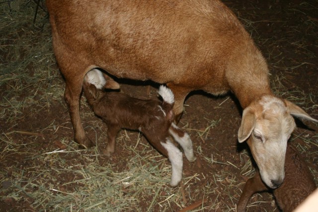 Here is a picture of the newest lambs (coffee flavors). We moved them and momma into the old wood shed for a few days due to the cold, windy, rainy weather. This keeps momma in one place and allows the babies to get stronger. We will let them out next week to run with everyone else. Our next ewe is due in a couple of months. I am hoping she has twin girls also. This is machiatto nursing. You can almost see her wagging her tail!