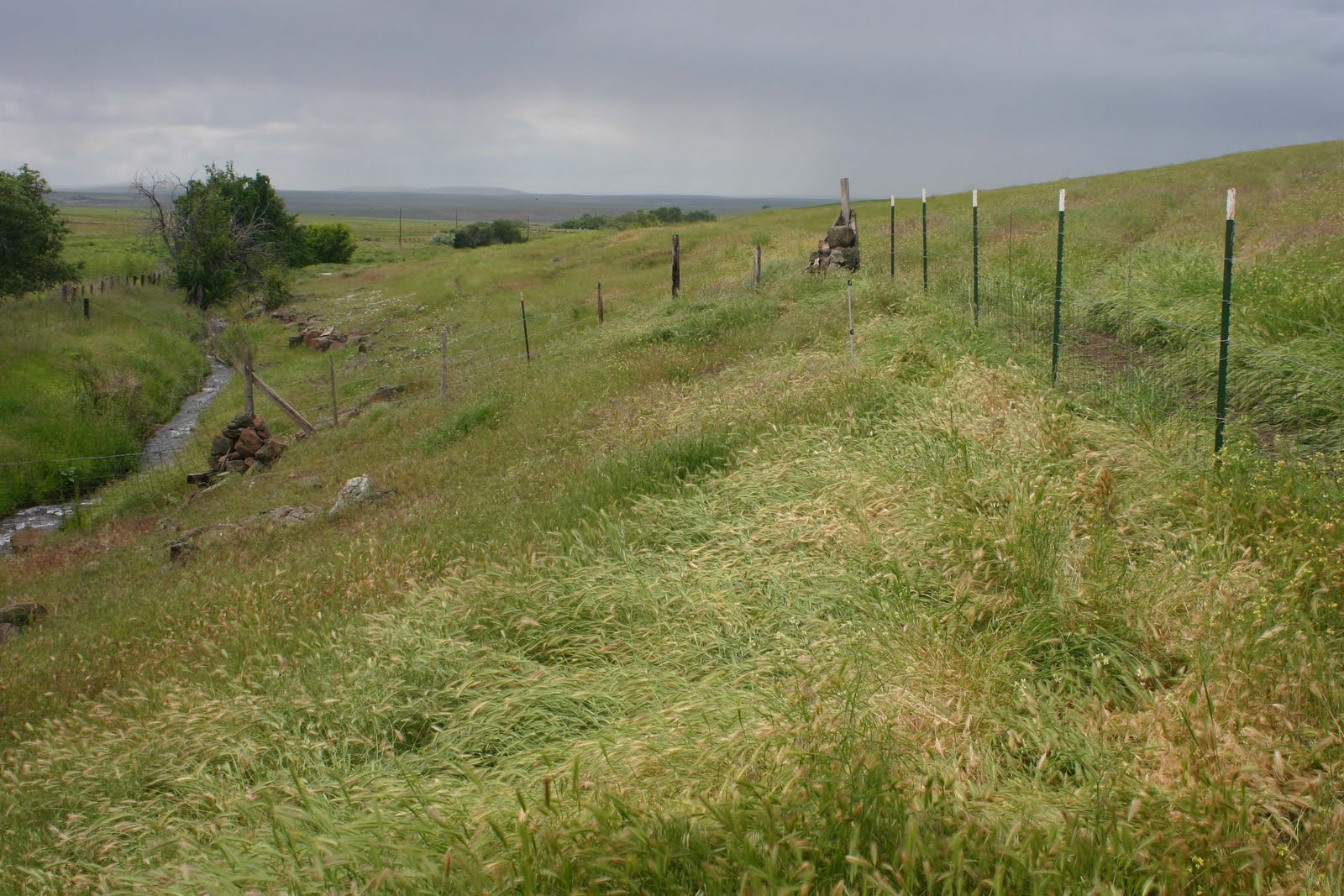 This is the completed fence looking Northwest. I had to reload the rock crib with rocks. The cows used my corner crib as a scratching post last year. I may need to run a hot wire on the outside of the fence for just that reason. We even ran sheep wire (woven mesh wire) along that small stretch between rock cribs. I actually need another rock crib halfway between those two. I tried to drive a post into the rocky hillside and it is kinda in but won’t take any pushing on. So, eventually I will have to add another rock crib.