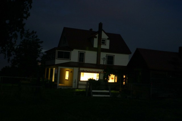 I was readying the car for the five boxes from the house and I noticed the 50# bag of chicken food. Sarah had just gotten home so I asked her if the chickens needed feeding. She said yes, so being the naive parent, I asked why the chicken food was in the car if the chickens needed it? So I lugged it to the coop and ranted to the child about the state of the chicken’s water and food when I smelled it, skunk. Annmarie had told me that the dog had found a skunk over the weekend. I had set the live trap last week, but had not put any food in it. I checked it every day, telling myself I should throw some bait (dog food) in it all week long. I looked up and sure enough there was a black and white stinky kitty in the trap (skunk). I also had to catch my little tiny showgirl hen baby. She had gotten out of her enclosure.
