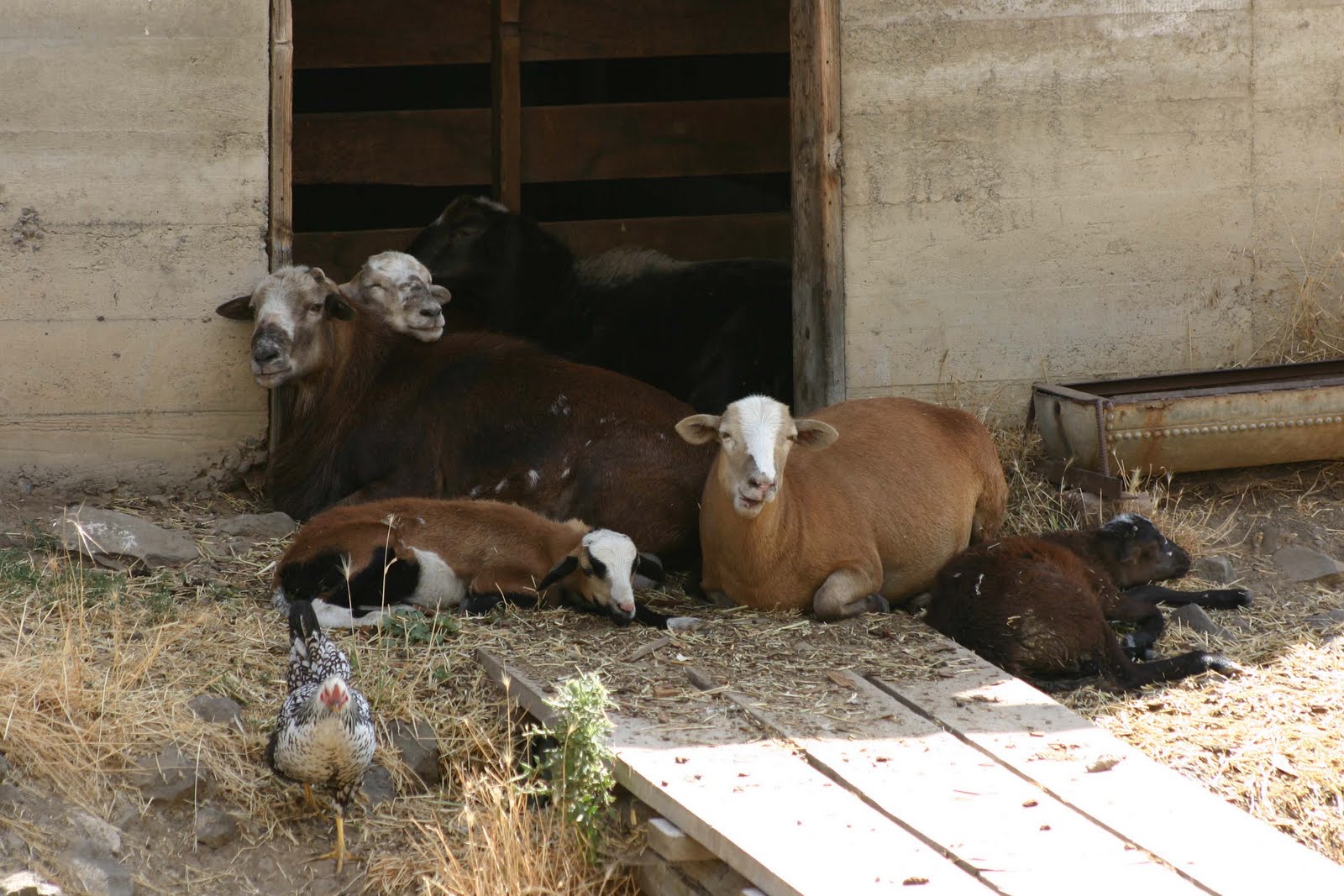 Here are the sheep cooling off next to the old wood shed. They love leaning up against the concrete on a hot day. The chicken is a Silver Laced Wyandotte. They are pretty fragile as chicks but I am having good luck with them as adults (if they live to adulthood).