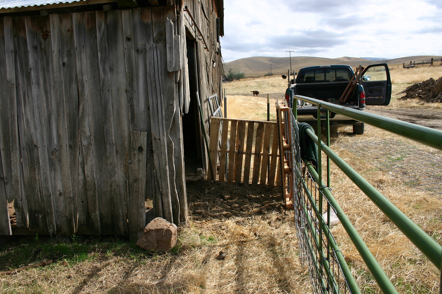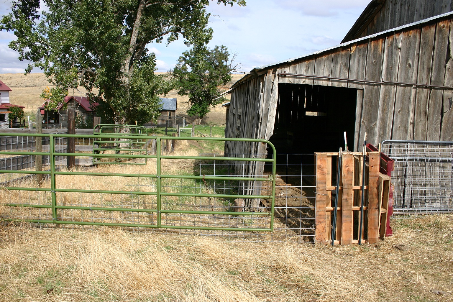 Here is a side view that better shows that. The panel will swing over and connect to the corner of the barn. The green gate swings shut also keeping the cows out of our pasture.