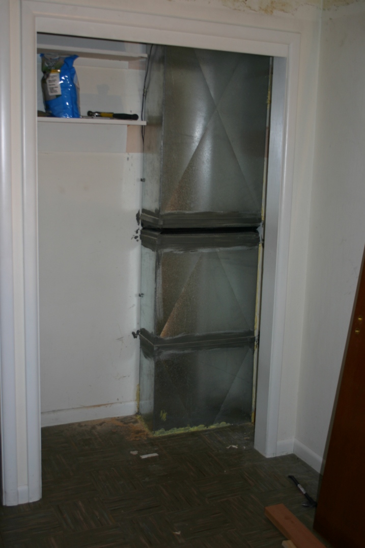 Here is the duct before I got it covered. This is a return duct to the central heating system. It pulls from the living room goes under the house and comes back up here. It goes into the library ceiling for about four feet. So we won’t be able to raise this ceiling unless we just want to box in the duct. I don’t really like that unless it is a basement so we will just live with the ceiling a foot lower in here than everywhere else. It is hard to tell since you have to go under the stairs to get into this room.