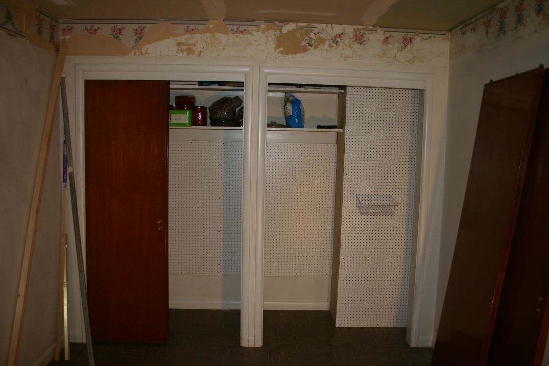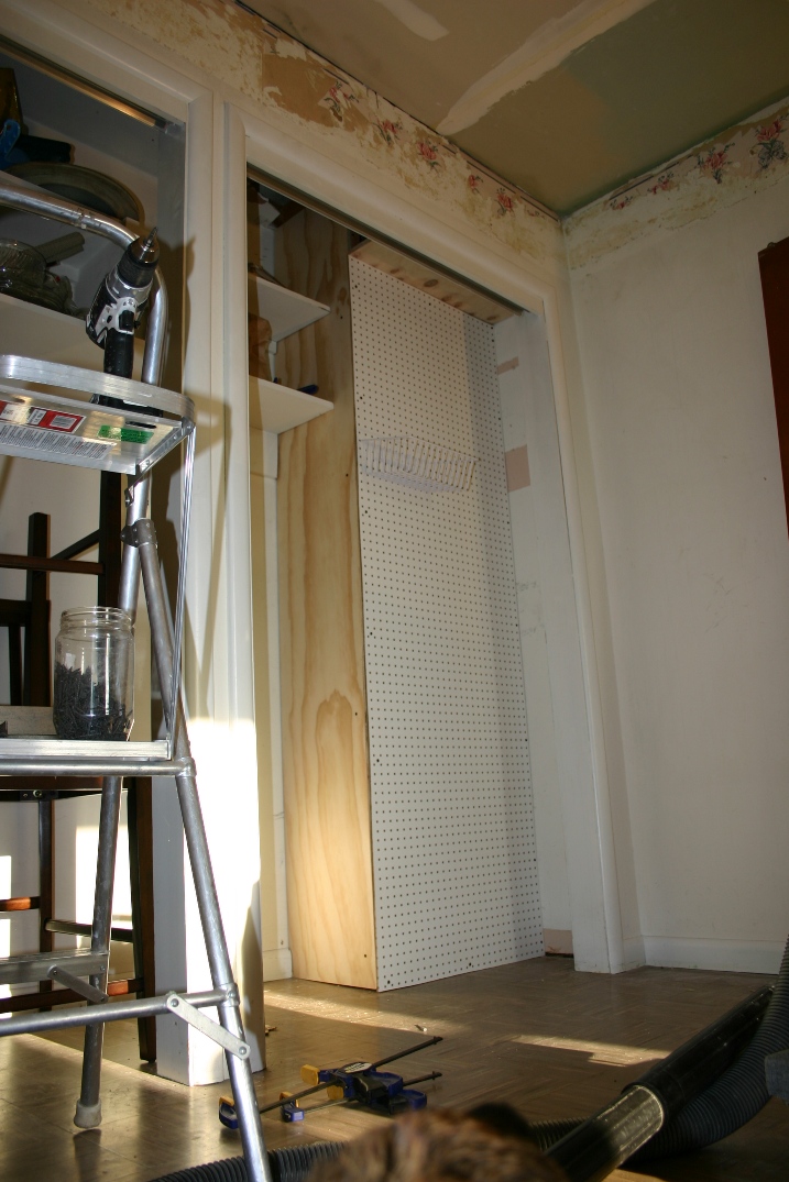 Everyone was gone today (still are) so I made great strides on the library closet (pause while I remove bandaids from my finger tips, too hard to type). I wanted to get the pegboard up in the closet, but I needed to close in the return duct going through the closet. As no lumber is straight anymore and no wall inside any house is square or plumb it was quite the endeavor. Yes, I did make a substantial blood sacrifice in the process. Any carpenter will tell you that it is essential when working in tight spots when nothing is straight, level or plumb!. I can finally feel my fingertips on my left hand now. I smashed them good. I was wondering if my primer’s stainblock guarantee covers blood? I tried to hide it all, but I think there is some showing. On the bright side, I only had to go to the hardware store once. I needed some longer screws. I had too short and too long, not just right. Besides, the hardware store guy, (name edited for privacy sake) buys eggs from me and I needed to deliver them. I randomly drop in with eggs every once in a while.