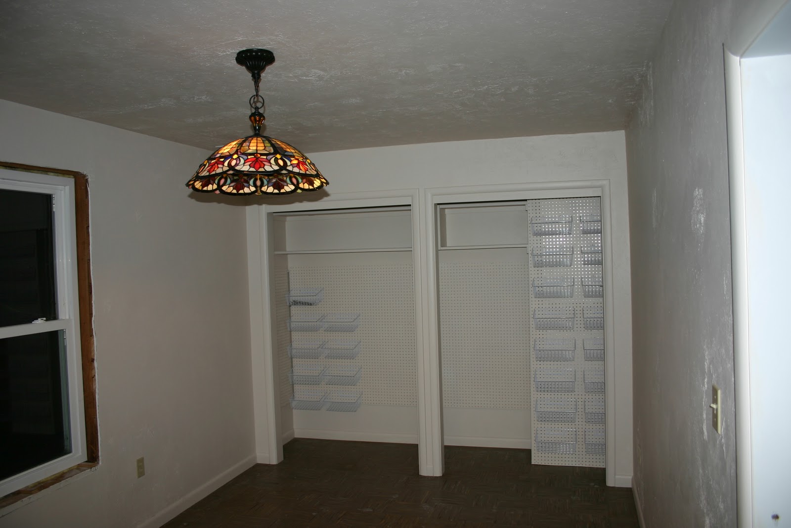 I wiped down the closet doors and lubricated the door rollers. I even put in new door guides. Because the carpet is missing now and they had shortened the doors I had to put in a shim to hold the door guides at the right height. Once the hardwood floor is in place I won’t need that any more. I put the end piece of pegboard in today and got it all primed and painted.