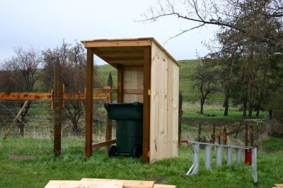 I am now planning to add some bird houses inside the enclosure. I will drill some holes at the top outer edges and line them up with a bird house that I attach inside the building. I am thinking about adding six houses. I will install pegs in front of each of the holes so the birds can get in and out. Maybe the birds will help keep the yellow jacket infestation down to a dull roar. If not, it will still be cool! I do have plans to add a metal roof, but I needed to get the wood up first. It looks good with a wooden roof, but it would not hold up in the weather. I moved the trash can into the enclosure already. I am very tired of picking up trash!