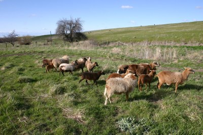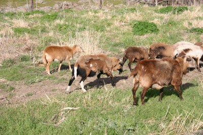 In the orchard sheep picture you can see all the babies. The three sheep directly behind the wooly sheep in the foreground are the first three babies we had earlier this year (almost 12 weeks old now). The newest lamb (cat sized one) is on the left side near the back. She is right behind her mother. The sheep are starting to lose their Winter wool. They scrape it all off on the fence and whatever else they can rub against.