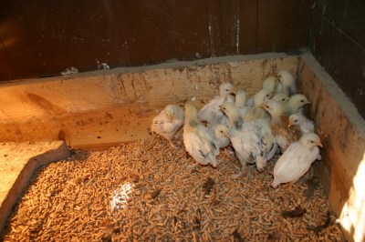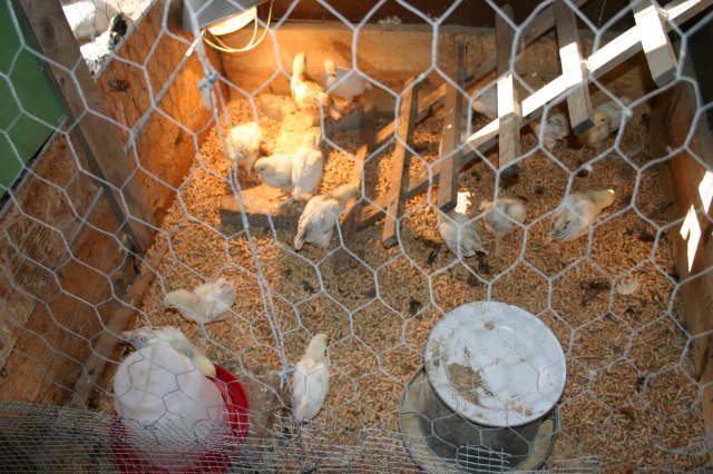 | Chicks running around in baby enclosure. No adult chicken or cat can get inside. |