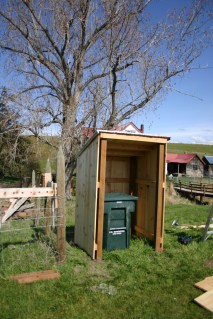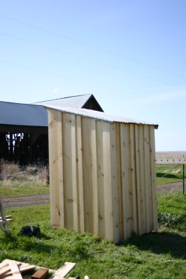 Well I managed to sneak in about three hours of progress on the trash enclosure. I am making it look just like the barns. So that means lots of details and those are taking longer than I anticipated. After a phone conversation with Annmarie in which she said she usually triples my time estimate on each job, I realize I am right on track using her schedule, behind on mine. I got the roof and two sides completed sheathed and ready for decoration. I sided the far side but still need to put on the seam slats on that side. The roof involved lots of hammering. That metal did not want to bend over the sides or front! Enough colorful language and elbow grease plus some screws got it to stay in place. I did manage to not smash my fingers, thankfully. I had to tear down the 1×12 on the table saw to get three inch boards to use as seam slats. I needed quite a few of these. I can sure tell which boards have the large knots in them. As the slats come off the table saw they fall apart because the knot is larger than three inches. Lost several boards that way. I figure I will need those scraps for something later on. Now to just figure out where to stash them until they are needed?