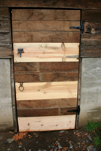 | Completed wood shed door. Yes, the concrete walls have moved in the last 80 years and the opening is not square. |