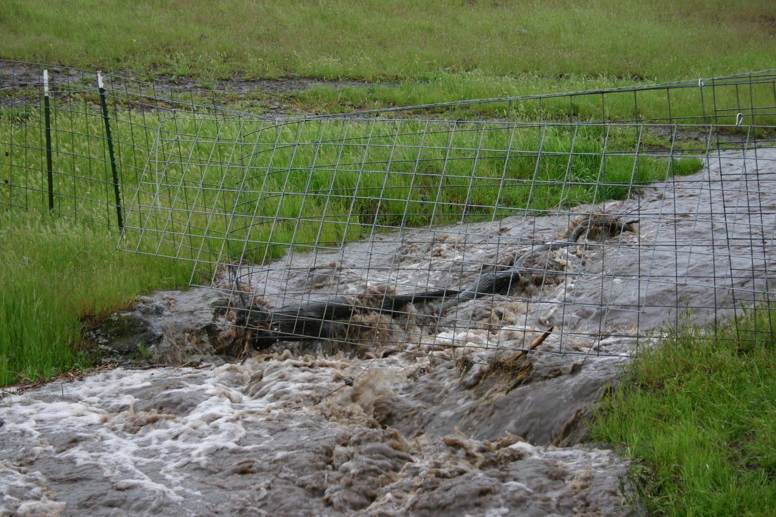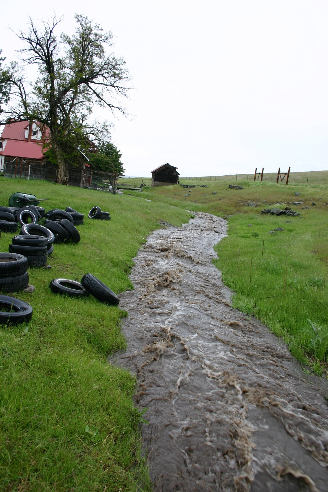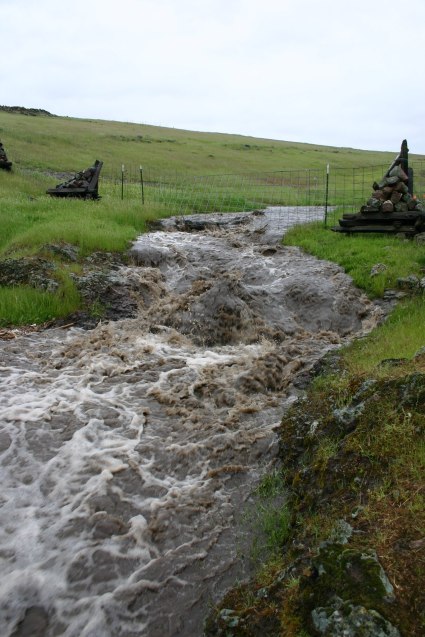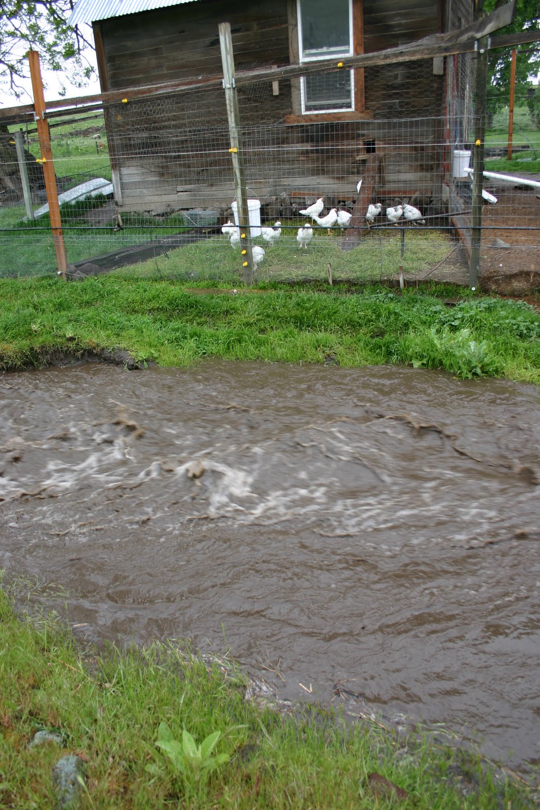 I went out to the chicken coop at lunch today, patrolling for predators, and the back creek is running! The rain is coming off the mountains in spades. Of course when the clouds cleared and I got a look at the mountains they are totally white again. So I spent an hour raising my fence out of the water so it doesn’t get ripped out by the flooding waters. As usual I had wired the fence to a cross wire in the middle of the stream. I had to hang on to the top of the panel, crawl out on the panel over the water then lean back to reach down to the water level to unwrap the wire. I am hanging backwards and facing the dark muddy water rushing underneath me. It is very disorienting. I had to concentrate on the wire and ignore the visual effects I was getting from the roaring water. I trudged up the creek to the other fence crossing and had a log jammed into the fence. I couldn’t pull it out due to the water volume/speed, so I had to trudge back to the shed and bring the ax back to the fence. I chopped the tree loose and pulled it up onto the side of the hill well away from the water line. At this rate my chicken yard might get flooded. As long as it doesn’t rip out my chicken fence all will be well.