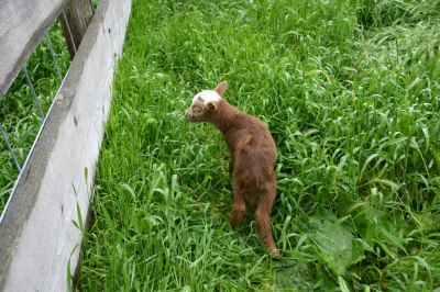 Once we crossed the creek and headed up to the barn the dog started throwing a hissy and whining and bugging something on the ground. I flashed the light that way and spotted an adult sheep running away from the dog and the dog trying to lick and step on a new baby lamb! I went over and picked the lamb up and told the dog to look for another one. She ran around but did not find another baby. The mother had ran into the barn with the rest of the sheep. I stuck the baby in the barn and waited for momma to come claim it. She did so I went back inside and informed Annmarie. We decided that we had better start locking the sheep up right at darkness. It had only been about 2.5 hours since the sun had gone down when she had her baby.