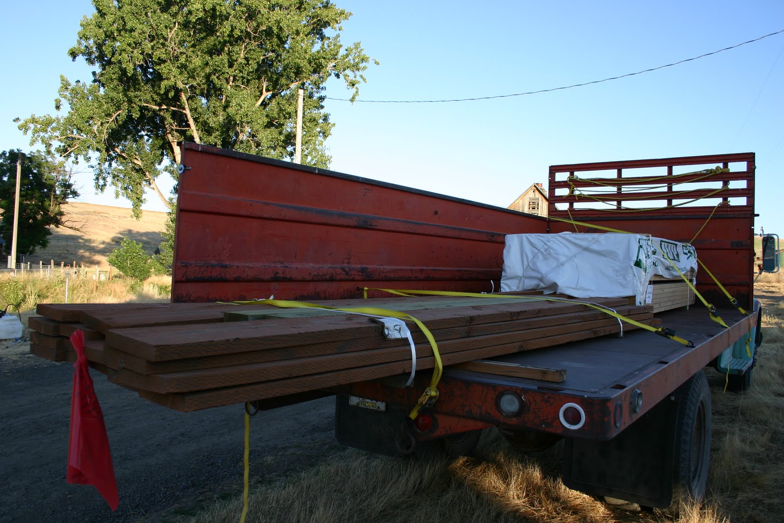 Sarah and I had to make a second trip to town to pickup some used lumber and a 12×20 dog run (all free, best price). It was hot!! 95 degrees and we were parked on the railroad tracks on hot pavement loading up the pickup. She did ask what would happen if a train came. I told her they would honk (it is a private freight spur for the flour mill). I figured we were pretty safe on a Saturday. We came home and had to unload everything in three separate spots so it was all in the correct location.