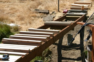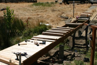 I had three people helping me out this day. It took two people almost 1.5 hours just to assemble the second beam. Moving a 42 foot beam made out of 2×10”s is not easy. Once it starts to bend back and forth it is almost impossible to hold onto. Having to cross the creek with the beam did not make things easier. Of course we ended up having to trim both beams in place as they were too long to fit. By noon we had just managed to place both beams and had been at it for five hours already. I was not certain we were going to get it done over the weekend let alone that day.