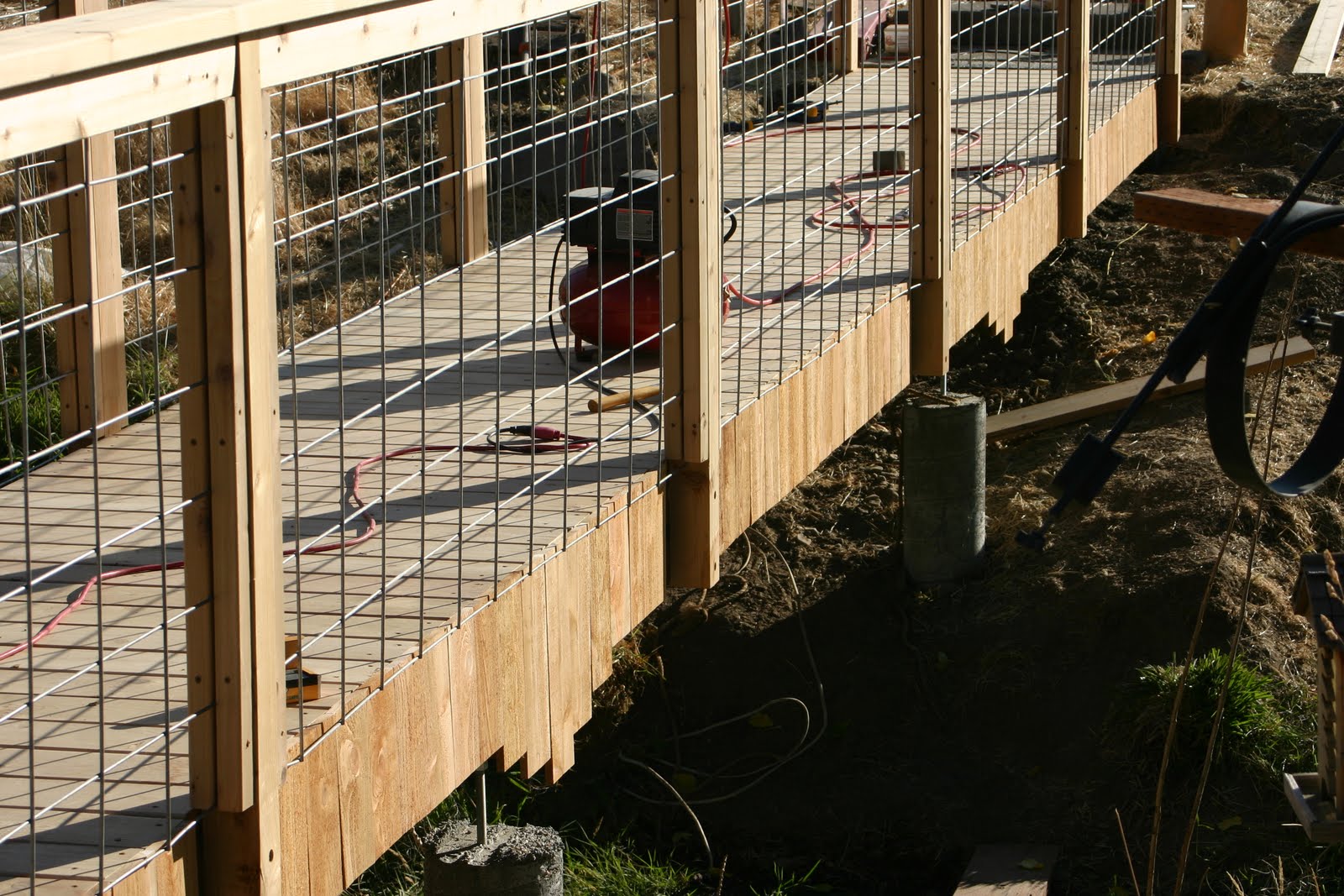 I even have enough left over pieces to add about 24 feet of railing up the walkway towards the driveway on one side. Again, since I have to dig some post holes for this I am going to wait for the tractor to make it easy on myself. It is going to look very nice by the time we get everything completed. Now Annmarie thinks I should case in the concrete pillars with cedar and hide those also…