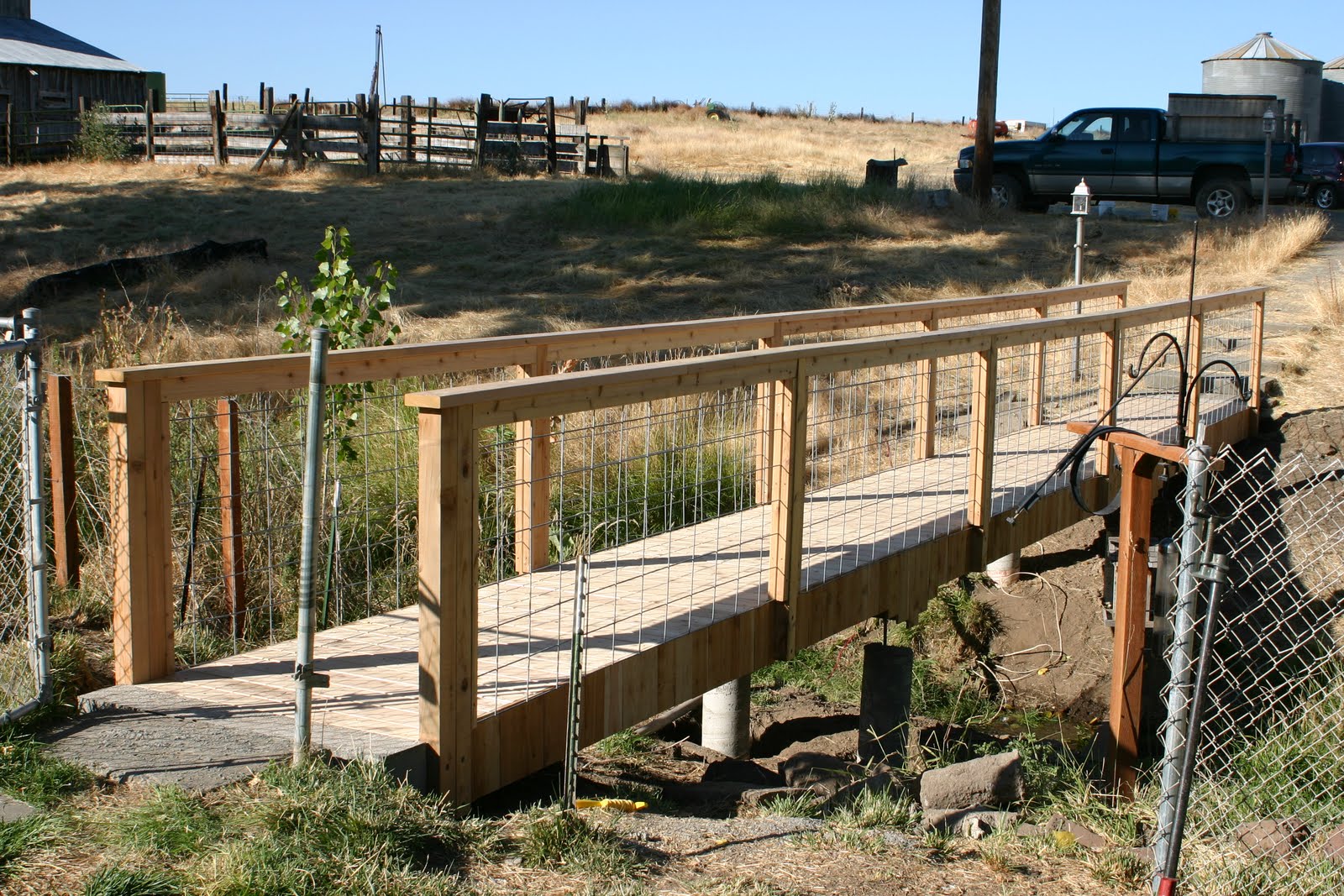 We measured the bridge corner to corner after installing the beams. Now mind you the beams were each 42 feet and 2 inches long, same for each beam. Not so much when you measured corner to corner. One corner was three inches longer than the other!! It never occurred to me to check this dimension when I was building the concrete forms. A definite newbie mistake. Luckily, one that is easily corrected by just scootching the board a little wider on one end. It worked and you cannot tell just by looking that we fudged the distances. By the time we got to the railing it all seemed to fall in to place. We had the whole bridge completed, including facing, by 1900 that night, twelve hours from when we started. I was thrilled! The bridge looks fantastic and after we rip out the front chain link fence it will look even better. I am going to wait for our tractor to show up before I do any digging or ripping up anything at this point. It will be a huge time saver.