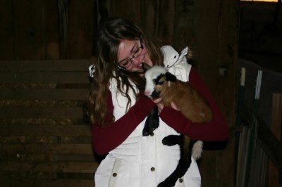 | Sarah snuggling one of the lambs. It is impossible to not smile when holding a less-than-one-day old lamb. |