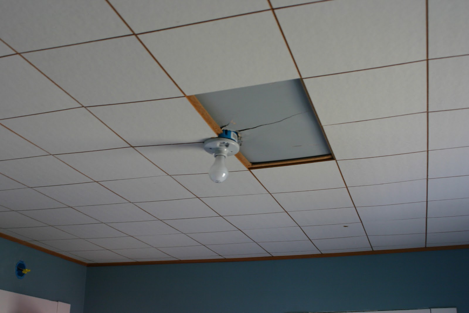 I did manage to get this tile replaced yesterday. I had found some old ceiling tiles in the attic four years ago and saved them for repairs. Unfortunately, they were not this exact tile. I put it in anyway, it was a newer version that was painted a brighter white and the groove was not quite as deep. It won’t be noticeable after we paint. What a pain in the butt to install a tile like this in the middle of the room! That single tile took me almost an hour to install. I had to pull loose all the surrounding tiles in an effort to get me some fudging room to squeeze the tile in place. Then I had to staple it up. Since I had the stapler out, I went through the whole ceiling and stapled all the loose tiles. The ceiling looked like a kiddie roller coaster before the stapling job. It looks pretty good now.