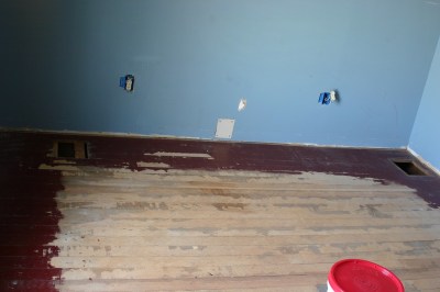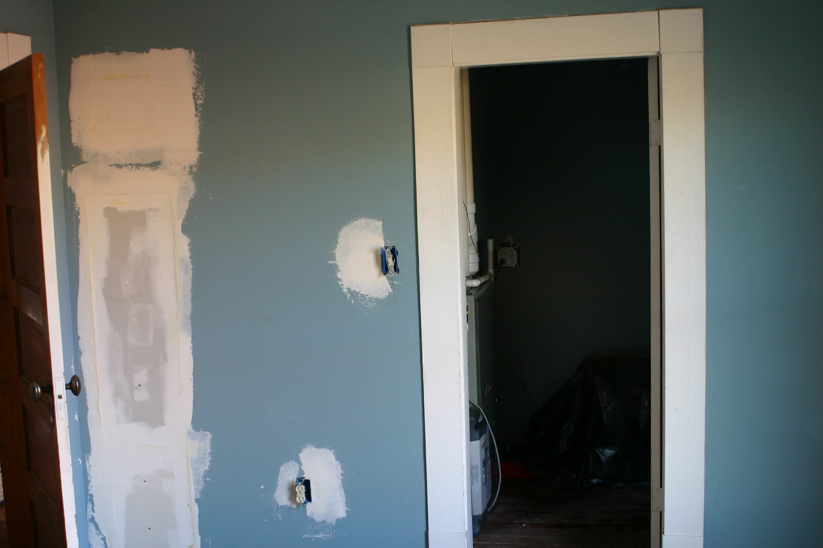 I have subsequently put on two different layers of mud on the holes in the wall. I even sanded between them. I will sometimes just knock down the high points with a knife and put on another coat. I am making sure to go really wide around the outlets so I get a nice taper all around them. Yesterday I made an executive decision (scope creep) to strip the doors and trim around said doors. I have some citrus based paint remover that works very well. I had six bottles in the old house for just this reason but had not used it yet. I thought that it might be painful so I was delaying the inevitable. I pulled down the door going into the furnace room and then slapped stripper on all the trim around that door, then put stripper on the back of the room door and all the trim around that door. I let it sit for a few hours and went up after dinner last night to scrape. Ugh, it was hot and sweaty work. The stripper worked well, but there are THREE coats of paint on all the wood.
