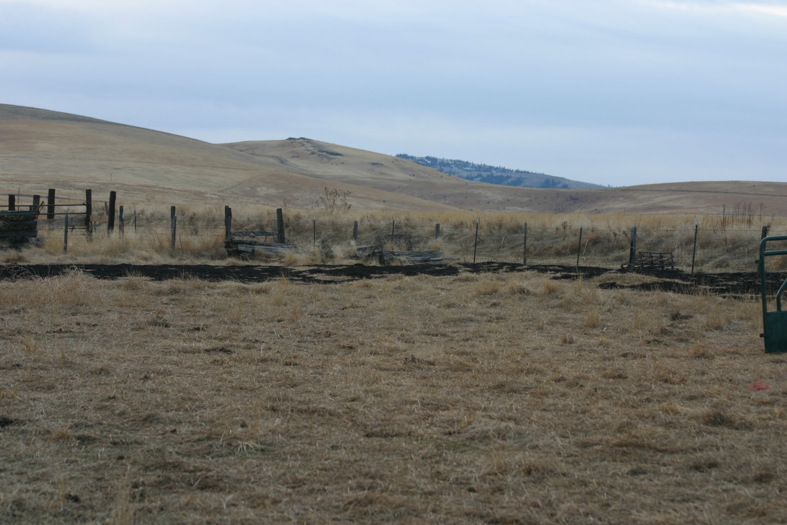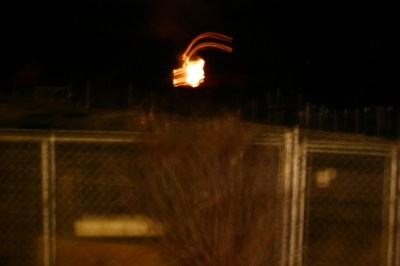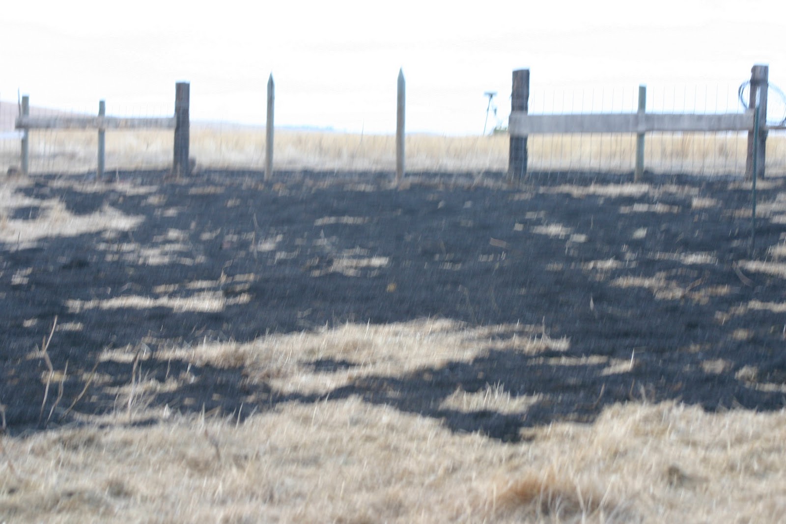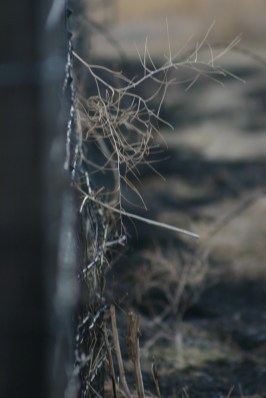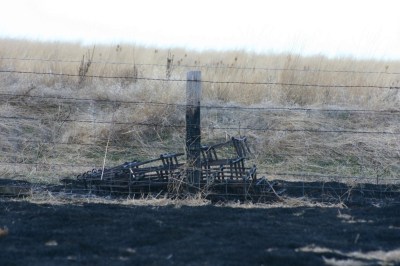 | An occasional weed lodged in the fence escaped a fiery death. |