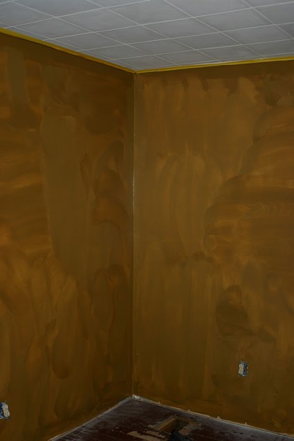 I spent most of the day painting today. Three walls of gold and one wall of dark green. Color, lots of color on the walls. White is my normal color of choice. I also mounted railing for two different shelves in the furnace closet. Still need a second coat of paint every where then I get to paint the ceiling. The yellow tape is special tape that gives a clear paint line. Will know next week if it actually works. I have to let the paint dry for 24 hours then I supposedly can apply the yellow tape to the new paint without it causing any damage. I have to tape the new paint so I can paint the ceiling next. Hopefully, by the end of next week I will have the room all painted and ready for floor work.