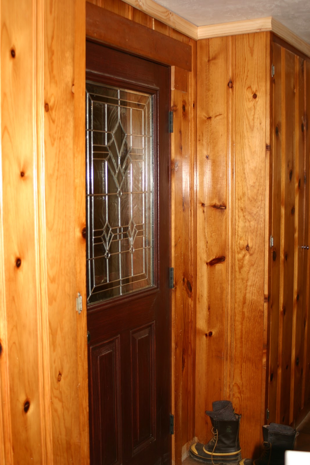 White, yellow and green were the colors discovered. Only the first two colors wanted to come off easily. So I had to add a second coat of paint remover. Unfortunately, the stripper had started to dry on the entrance door so it was harder to remove. I decided to only second coat the door that I had taken down. Today I will strip everything else. This last coat of paint is going to be the hardest to get off. I want to stain the wood again. I realize this is a far reaching goal, but I am not a man who loves painted wood. Wood should be seen not covered up. I am going to take some hot soapy water and a greenie scratch pad and try and get every little bit of paint off the door this morning. Trial and error, it is how you learn.