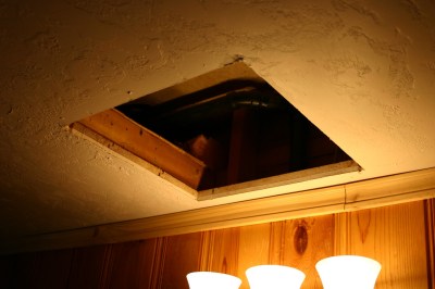 I did manage to get this tile replaced yesterday. I had found some old ceiling tiles in the attic four years ago and saved them for repairs. Unfortunately, they were not this exact tile. I put it in anyway, it was a newer version that was painted a brighter white and the groove was not quite as deep. It won’t be noticeable after we paint. What a pain in the butt to install a tile like this in the middle of the room! That single tile took me almost an hour to install. I had to pull loose all the surrounding tiles in an effort to get me some fudging room to squeeze the tile in place. Then I had to staple it up. Since I had the stapler out, I went through the whole ceiling and stapled all the loose tiles. The ceiling looked like a kiddie roller coaster before the stapling job. It looks pretty good now.