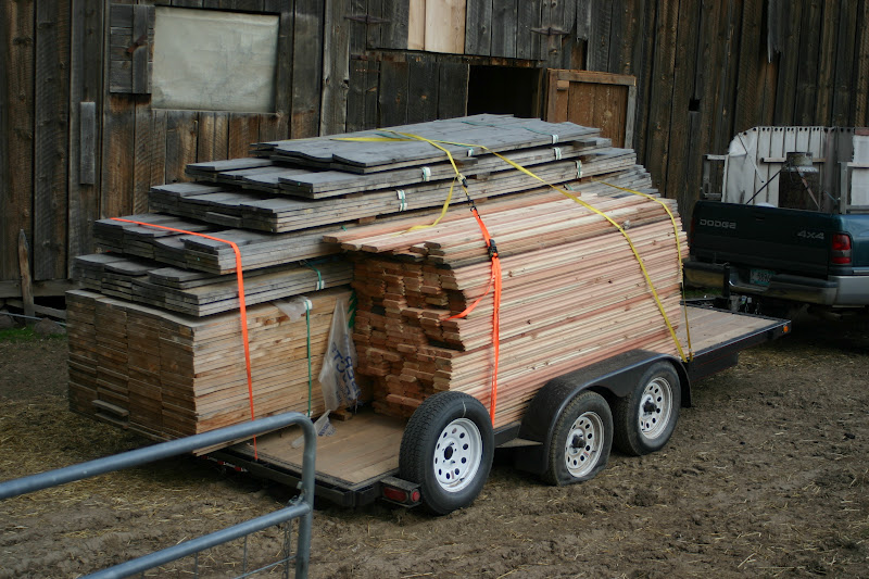 | Wood for barn siding and part of floor, notice flat tire and mounted spare in spare holder keeping trailer off ground. |