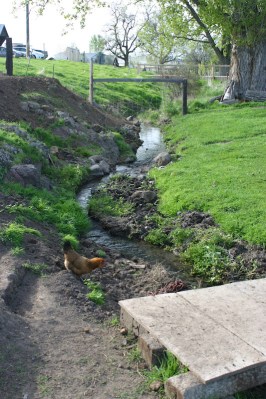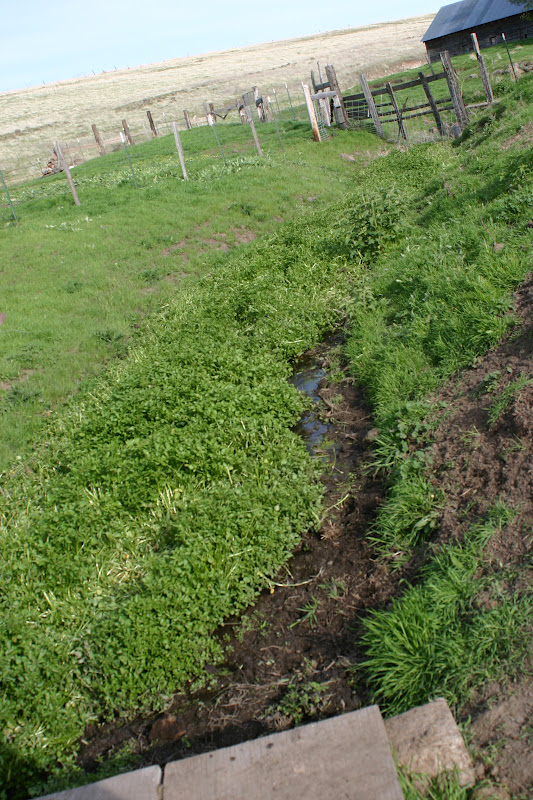 As an aside, I have been working on the front creek. Mostly when I got tired of digging under the barn. It had filled with cow poop and widened drastically. I just dug a new channel and tossed all the extras to the sides to help stabilize them. There is an actual gravel bottom, not just mud! I will plant the sides again so they firm themselves up. The poop is starting to dry out now that water is not trickling over the top of it. If you look closely at the part of the creek I have not dug out yet you can see what I mean. I locked the sheep in the barn lot yesterday hoping they would eat down some of the green in the creek. They found the hole in the fence next to the barn and have disappeared from their appointed location, go figure.