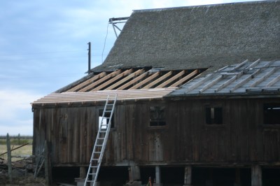 We did manage to get about an hour on the barn roof. I screwed down the supports today and we started to put in the cross beams. I am hoping to get those fully installed tomorrow after the weather quits cooperating with the weed spraying (wind blows). Mr. President is going to start tearing off the old granary tin roof tomorrow. We have to install two safety points so he can hook in his fall harness. Plus the cell phone in his pocket is necessary to call for help. He tells me he does some rock climbing so he can probably get himself upright. Hopefully, he doesn’t fall and the safety equipment is just a pain in the butt. I will make him wear it. Better safe then sorry after falling off the roof.