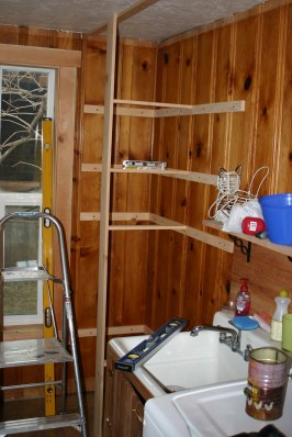 There was only 3 eggs today. The chickens are not even producing 2 dozen eggs/week. I want to get started on the laundry room closet this week. I brought some more tools inside the house and set up my compound miter saw outside on the old house porch. Now I just need to measure for the shelves and see if the corner is actually 90 degrees. I am going to install the shelve brackets first on the two walls and then attach everything to them. This will make construction easier for me. I just have to get all the measurements figured out before I cut anything.