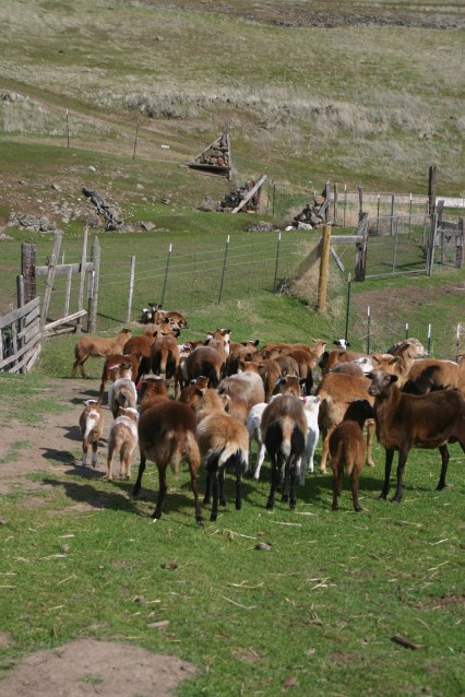 Today the girls and I went out to worm the whole flock. We had a couple of boys to rubberband (castrate), and one to retag. Zeke herded everyone into the barn then the girls started to try and catch everybody. The girls wanted to just grab fur and hold on. I kept encouraging the belly flop method but it wasn’t catching on. I finally had to start catching also. The belly flop method does work, I may have had more sheep dung covering my entire body than either girl but my success rate was higher. I even had a twofer!
