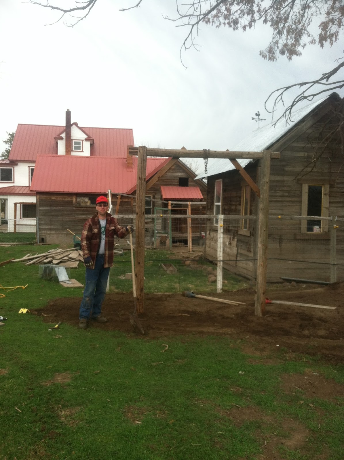 Yesterday was a productive day. Kelly, from work, came out to the house and we worked on installing a pole system so we can skin out and wash off an animal carcass. I put it near the chicken coop so we could get a hose to the area for cleanup and it is out of sight from the house. So if you are inside the house you cannot see it. There were a couple of old small power poles stashed on the property so we used them. I may have to shorten the chain so it is right next to the cross pole. It will give us a few more inches of lift. The poles are sunk into the ground three feet so they are pretty sturdy. We reused the old wood bolts and washers from the foot bridge that was replaced last year. The 45 degree pieces are from the trumpet vine arbor that got broken from the ice sliding off the house roof. I am trying to repurpose as much stuff as possible so we don’t have to buy new.
