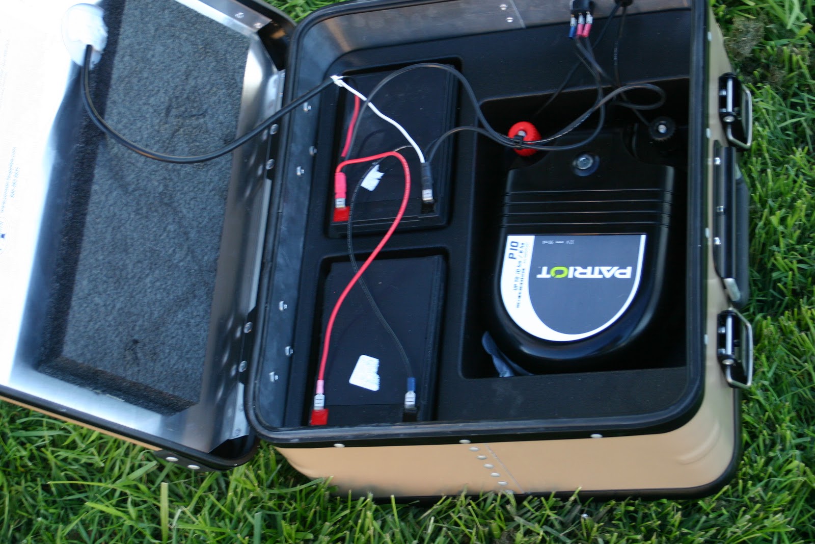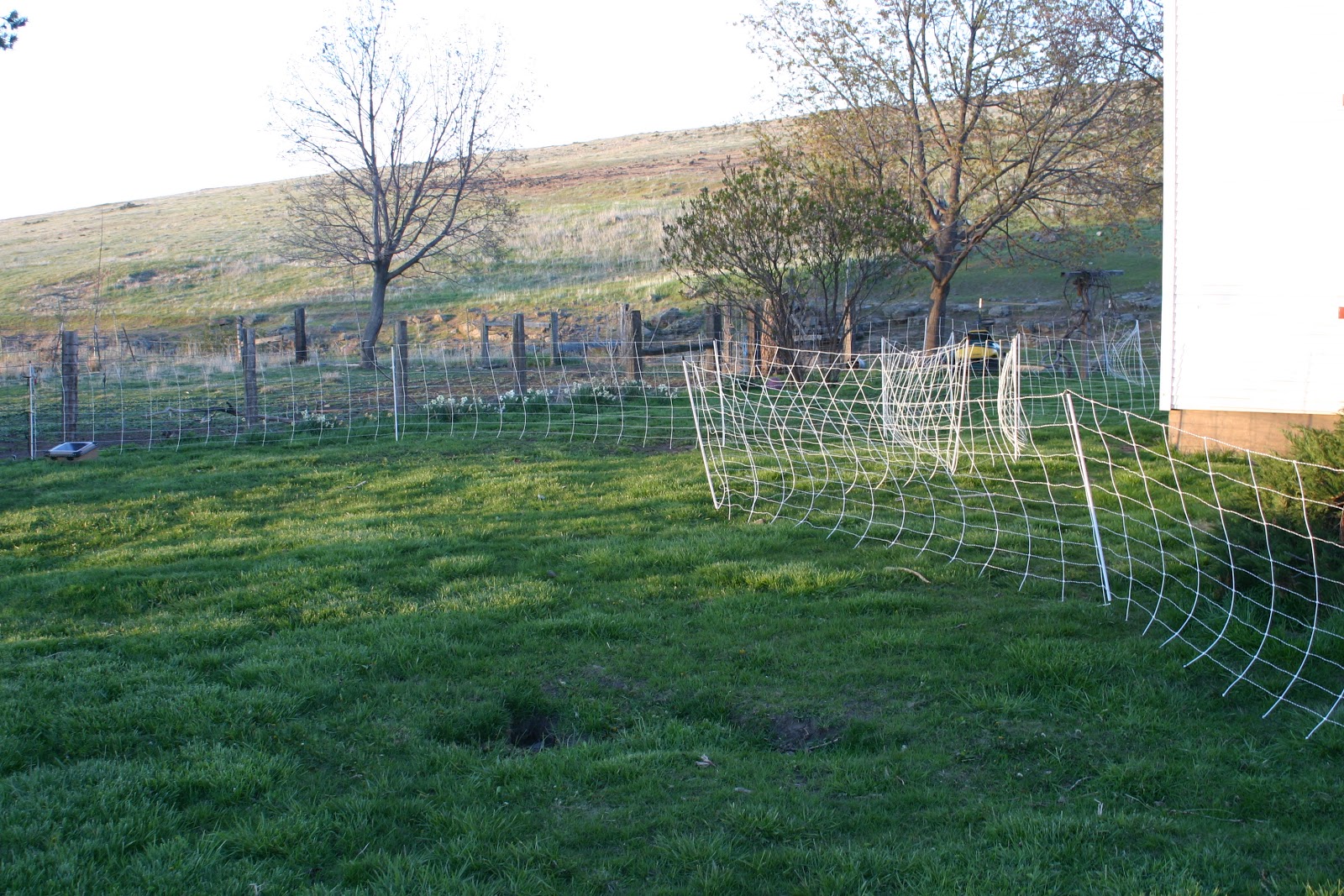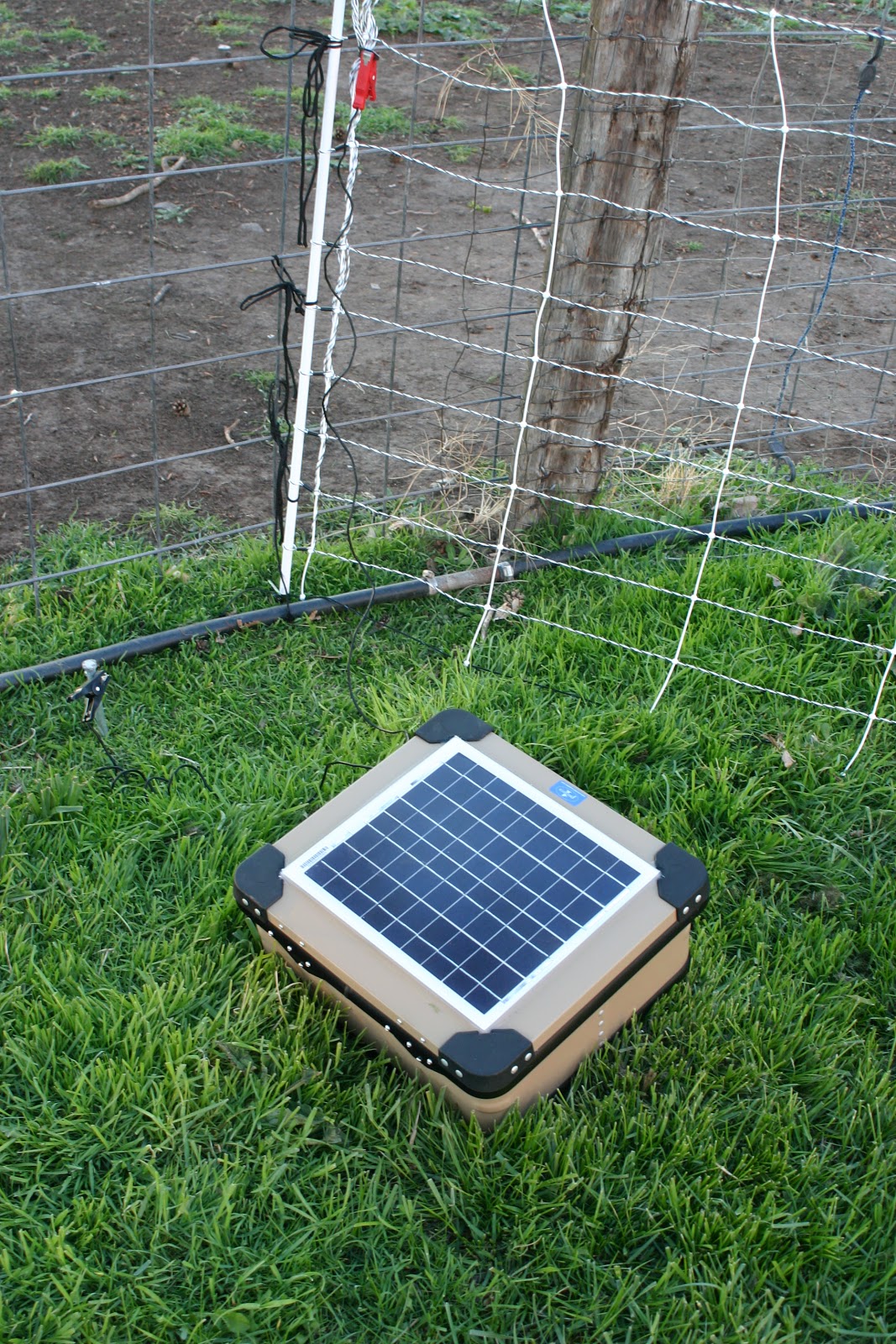 The electric fence charger came yesterday. We ordered an all in one unit designed and made for Premier fencing. They do mostly sheep gear and are a working sheep farm. Great products, worth the price. This is a self contained solar charged electric fence charger with batteries, switch and clamps all in one heavy duty aluminum watertight box. I wanted to hook it all up and see how it worked so I strung it out in the front yard. Needless to say there were some issues.
