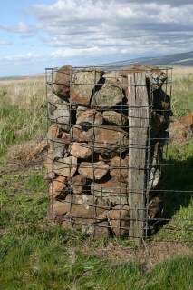 I then went up on top of the hill and started working on getting the barb wire moved. I rolled up the bottom strand and cut it loose from the fence. There used to be several rock cribs on the fence eons ago but they have disinegrated into a pile of rocks with the occasional piece of wood sticking out. I needed one to pull the woven fence tight. Luckily, right were I ran out of woven fencing is where an old rock crib used to be so I implemented my new rock crib plan and used a cow panel. I used a 12 foot section and formed it into a circle and then bent the cut bar pieces around their neighbors. It is mighty sturdy. It took a lot more rocks to fill than I expected. I had to toss rocks for over 20 minutes to get it full and the rocks were right next to the new crib.