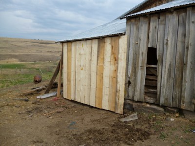 After lunch we went out to the barn but due to several thunderstorms and some torrential rain, no roofing was going to happen today. We decided to work on this end of the barn and fix the horse area. We cut out the back wall and added supports and a new wall. I went along the side of the building and screwed down all the loose old boards. We still need to add the batten between each wall piece of wood and get the feed stall area subdivided so each horse has its own area. No more stealing of food or chasing away will be allowed.