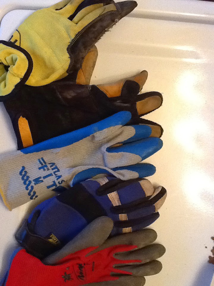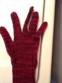 I also found several sets of gloves that I would not categorize as work gloves. Now, Sarah’s not very good about separating work gloves from non-work gloves and for the most part I really don’t care. I did, however, care this time. I found this lovely hand-knit custom glove that I started last spring in with the work gloves. I’ve gotten distracted and haven’t quite finished its mate, but still, this lovely little wool-silk designed and created by me glove is decidedly not a work glove!