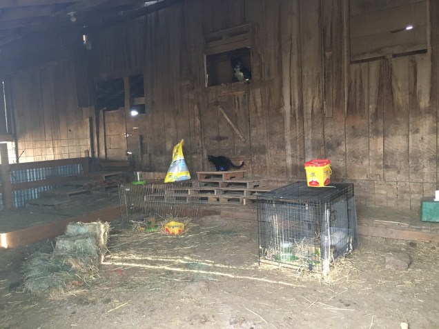 The director from PAWS called us today. They had some reject cats for us. The only reason they are rejects are they don’t like people. This makes them very hard to adopt out to homes. We use two dog kennels and we feed and water the cats for a couple of weeks. Once they recognize us and that food and water come from us then we will let them out. We feed the cats every day when we feed the other animals so they can just live in the barn. There are lots of places to hide and to stay warm. The cats are all neutered so we don’t get kittens and the cats get to live life on their own terms. An added bonus is the cats control the mice in the barn so the hay does not get destroyed. Everyone comes out a winner, the cats, us and PAWS. We got three adult cats today. If you look closer at the picture you will see our other PAWS kitten on the steps, three cats in the kennels and look up at the barn door opening and you will see Mouse standing on the hay looking out!