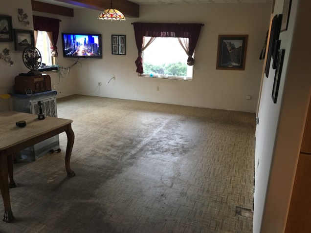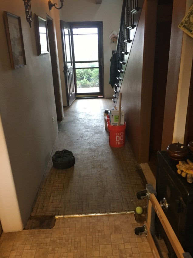 Day 1 was spent clearing out the downstairs. We used the kitchen, the downstairs library, upstairs spare bedroom and our bedroom to stash all the furniture. The kitchen had to store the couch and the old safe as neither could go upstairs or into the downstairs library. You cannot even get past the door frame into the spare bedroom. It is jammed full of everything. The dogs do not get any more toys! We are officially in a dog toy buying drought. We must of found 30+ toys trapped under the couch and loveseat. I am seriously considering building a square frame that hides under the couch and loveseat that prevents any toy from rolling more than 6 inches under the furniture. It was amazing how many toys were trapped in hidden realms. We left the dining room table but could stash it in the kitchen when we need to as Annmarie is in Berkeley for school for a week. There will never be a better time than now to jam everything into the kitchen. I just need to be able to get to the fridge, stove and microwave. Access to the sink is crucial as that is where water for the coffee maker comes from! I have to keep up a steady stream of coffee to survive. The second half of the day was spent driving to the Big Box hardware store for the needed supplies.