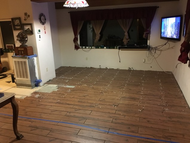 This is all that’s left to finish tomorrow. Mr Experience says we will be done by noon. This works for me as we can eat lunch and then drive to Hermiston to get our grout and grinder discs. We may need some more subfloor for the kitchen also, we will check first. I think there are 12 sheets left.