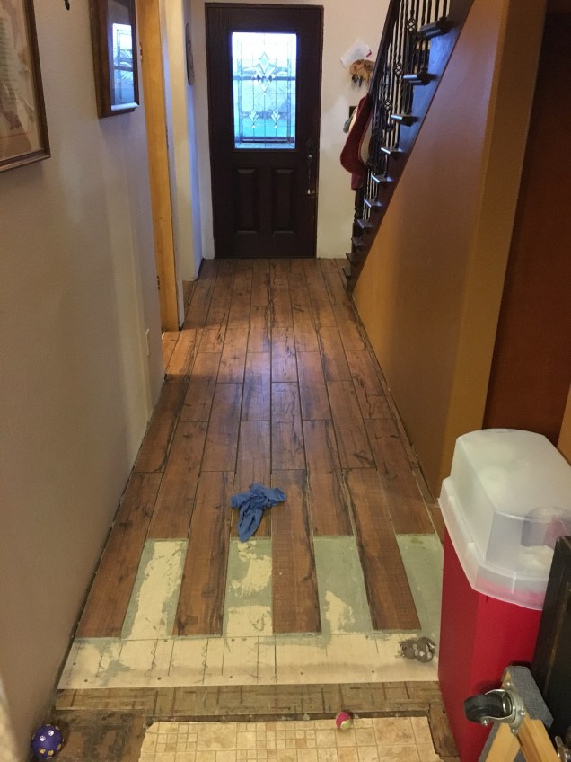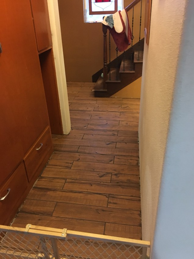 The entire entry way is done. The dogs are tired of getting moved around. This work has totally disturbed their schedule and sleep location. The big dogs have slept in the laundry room twice this week to keep them off the tiles. All dogs were kenneled during the day once and Gizmo had to spend several hours outside yesterday and came in shivering, he thought he had turned into a popsicle.