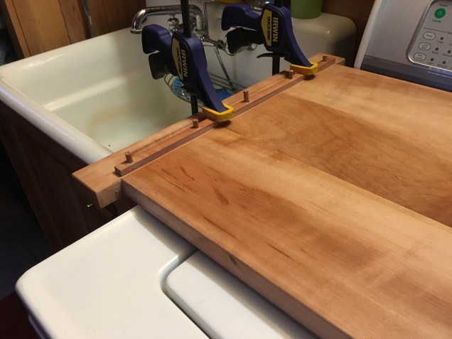 I wanted to fix the front yard fence yesterday but I got distracted. This is my single biggest weakness. I have so many things I want to do that I occasionally get distracted. Annmarie might say more than occasionally but we know that is a biased opinion. I think all wives would think that. So I got “side tracked” into finishing her cutting board revamp. I had a custom cutting board made for the kitchen to go into the premise slot. I measured it, sent pictures of it to a friend who does custom woodworking. He was swamped so he farmed me out to another guy. This guy did a great job except I wanted the pull part to turn down so that Annmarie had a stop to prevent the board from moving on the countertop when she pulls it out to make bread. Now if I would get our new custom island built I want to put a whole intact slab of granite on it so she can do her cooking counter work on it. Anyways, I needed to add a lip. Since I had measured the opening incorrectly (yes, I know I only had one job to measure it!) I had two 1/2 inch pieces from each edge. I sanded down one side glued and then drilled out five holes and glued in oak pegs. I will just need to cut them flush today, sand down and oil them and it will be done. It works perfectly with only a 1/4 inch lip, I tried it out.