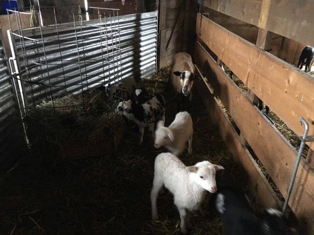 When I was out feeding in the barn yesterday morning I spotted a tuft of fur on the ground. I thought it was someone’s ear! The sheep catch their head on stuff all the time and rip out their ear tags. I bent over to pick it up and it was not an ear, it was a scrotum! The rubber bands were both still in place and intact but some little boy was now a whether instead of a ram, a job well done. I did stop and watch the lambs jump and play. I even snagged one and got some lamby time. They are super curious at this stage and are easy to grab.