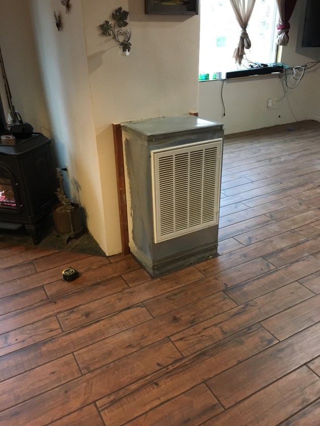 Since finishing the floor 24 hours ago the ventilation return has become an even worse eyesore than normal. It just stands out and draws your eye right to it. We had been talking about creating a wooden box, then a cabinet then shelves and I had finally settled back on the box idea. We worked on the furniture this morning after trying to clean the floor with our Kirby. It did good on the grout older than 72 hours but the living room was only 48 hours and it started to lift the epoxy grout so we stopped. Mr. Experience spent some time cleaning up the edges of the room. We decided to get the furniture fixed and back into the living room.