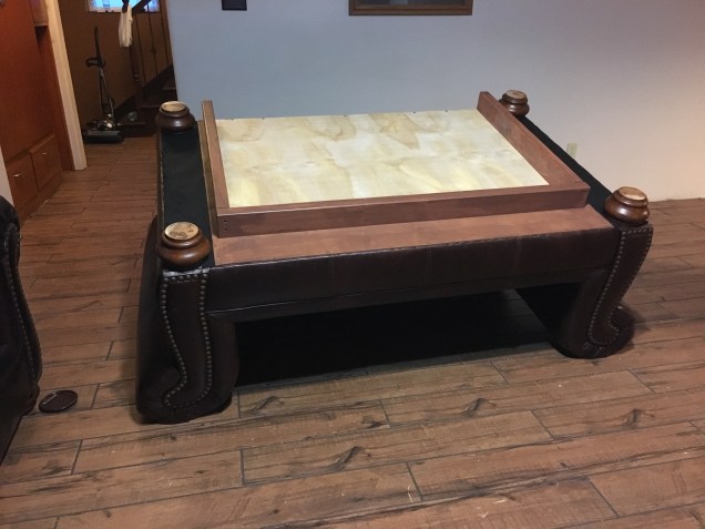 Gizmo and Mouse had chewed off the fabric on the bottom of the couches. So we decided to install 3/16 plywood on the bottom and then put some kind of frame on the bottom to keep the dog toys from getting trapped under the couches. There must have been 30 toys stuck under the couches when we moved them. I was just going to build a square frame and lay it on the floor. This idea was vetoed by both involved parties and it was decided we would attach them to the furniture. This took a while to cut them to size and install screw plates inside the bottom of the furniture. We also had to reattach the middle front leg of the couch as it had come unstapled. You do not want to look inside your $1000+ couch and see how much OSB and air is inside your furniture and how little real wood is used.