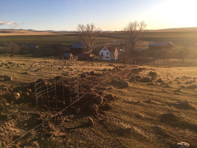 Once I had the fence path cleared and I attempted to create a few level spots for the wire cages I went and got some old cow panels. I was able to reuse the ones I had just gotten from the same place I purchased the culverts. I drug five panels up onto the hillside behind the tractor. I then cut off just the end vertical piece. This allows me to kinda roll it up like a piece of playdoh. The problem with this is it doesn’t want to go into this shape. I also have to put a lot of effort and body weight into the process to get the metal to form a circle so I can then bend the horizontal ends around the opposite vertical creating a ring. This ring then gets a wooden post nailed in it and filled with rocks. Once it is full of rocks it is virtually indestructible.