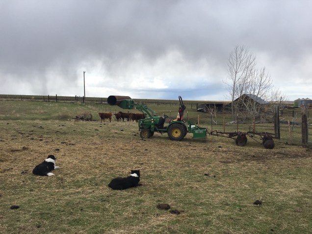 The little tractor that could! I have a culvert on the bucket and pulling a small set of discs for the upper field. The dogs are giving the cows the stink eye after moving them away from the gate. This way I don’t have to worry about them making a break for it to get back to the bull. It’s a two way street, both parties would go to the other if they could figure out how to get out of their respective enclosures.