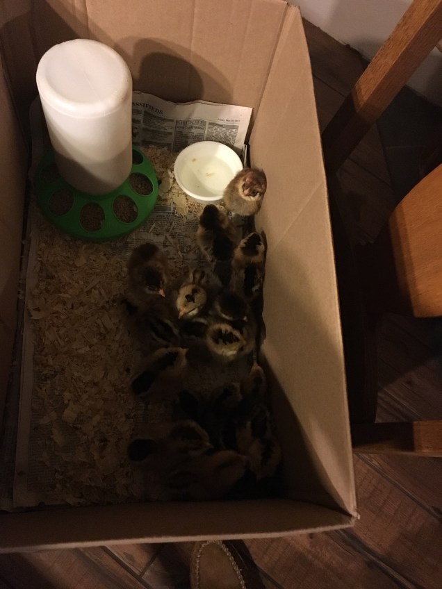 She called me on Friday morning to say that she had purchased 18 Easter Eggers! The local feed and supply store had just gotten them in and she snapped up half the easter egger pullets. They let her pick her 18 and she paid for them so they held them all day for her. I knew the brooder needed to be bleached out but figured I would have time after I got off work. I got off late and was bleaching the brooder, lid, waterer and feeder when she got home. I had pine shavings down in the root cellar so I figured all was good. I dried it all off and filled up the brooder with pine shavings from the root cellar. Cedar shavings are bad for chickens. I placed all this in the library downstairs and somehow managed to do it without Annmarie noticing then went out to do chores. She smelled the brooder and said it smelled like chemicals. I told her I used bleach only and it should be gone by now. It was then that Annmarie asked me if I was still storing herbicides in the root cellar and how long had the pine shavings been down there? After killing off most of my chicks one year by using varethane inside the house at the same time they were present we are more cognizant of chemicals. So I had to throw out the bedding and used a cardboard box and newspaper to get us through the night until I could go back to the store and get fresh bedding.